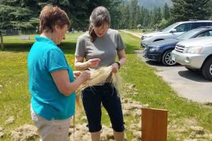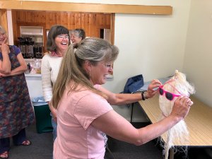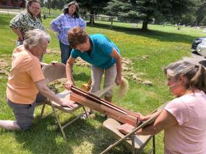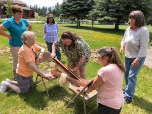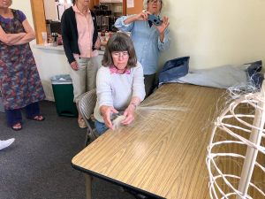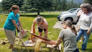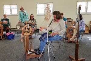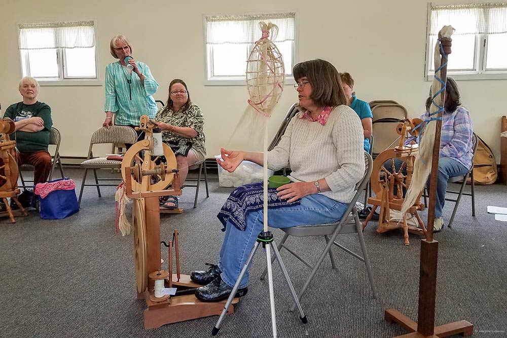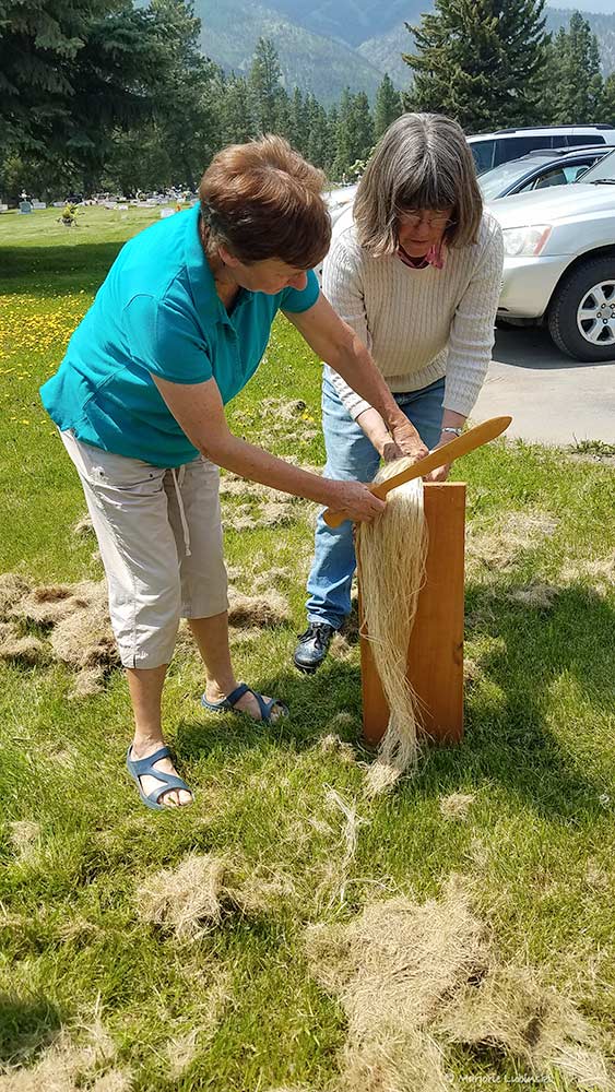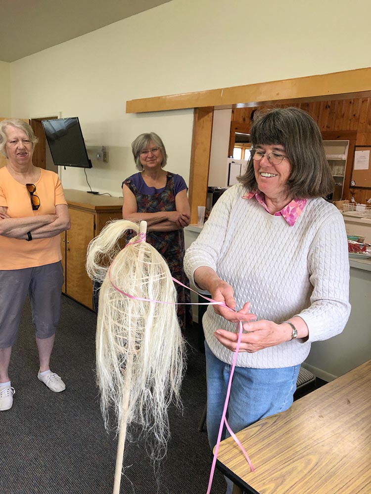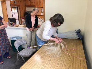 Flax Class May 2019 Karen teaching all the steps to process and then spin Flax. Photos courtesy of Rickie and Margie.